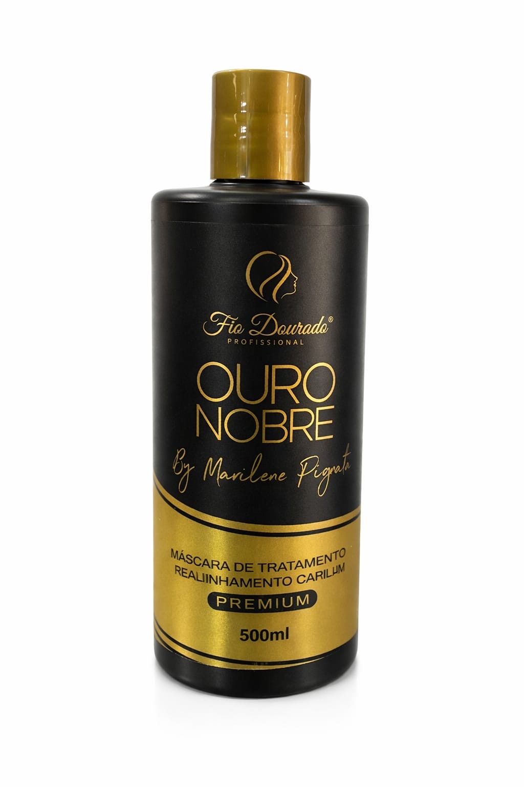 REALINHAMENTO OURO NOBRE: É um tratamento capilar intenso sem formol e ácido glioxílico, sem pausa de uma hora, para reconstruir e reduzir volume de toda fibra capilar, fornece nutrientes essenciais para restaurar a elasticidade dos fios extra-ressecados. Sua formula contém acído latíco, ácido tanino, macadâmia, semente de linhaça e pantenol, pantenol é fundamental para hidratação dos cabelos. Isso porque, ele possui o poder de atrair e reter a umidade , além de combater radicais livre.